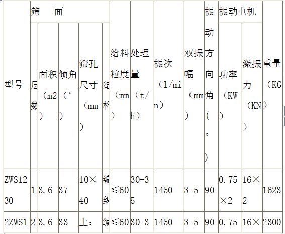 ZWS型振网筛产品型号及技术参数: